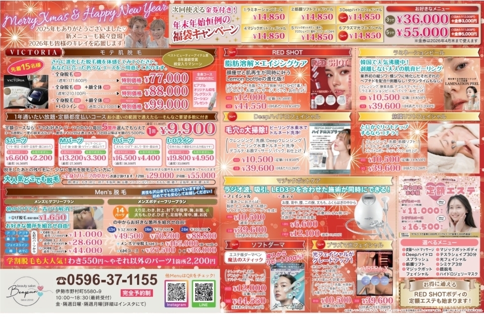 キャンペーン 2025.11.29 年末年始キャンペーン 2025年もあと1ヶ月余りとなりましたね😌今年一年の感謝を込めて毎年好例のビアプル年末年始キャンペーンを12月、1月と開催致します✨新メニューも続々と登場❣️お得な福袋もあります🎀もちろん、脱毛もキャンペーン価格に☺️皆様のご来店お待ちしております🫶 PDFを開く 一覧に戻る